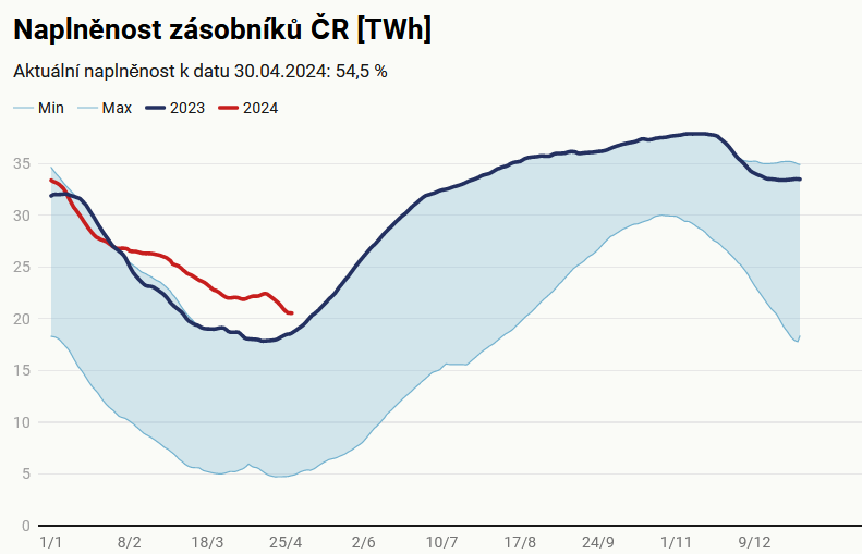 Zásobníky byly k 30.4. naplněny z 54,86 %, resp. činí 20663,8