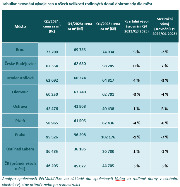 V Praze se starší domy prodávaly o necelých 7 tisíc korun za metr čtvereční levněji než před rokem, což znamená, že lidé loni kupovali dům o rozloze 150 m2 o téměř milion korun dráž. Praha je tak jedním z 6 zkoumaných měst, které vybočují z celorepublikového průměru, který ukázal meziročně 3% růst cen starších domů. Vedle Prahy ukázala analýza meziroční zlevnění starší domů i v dalších krajských městech. V Brně činila meziroční úspora na koupi staršího domu 2 procenta, což znamenalo cenu nižší o zhruba 260 tisíc korun oproti nemovitosti stejné rozlohy kupované loni. “Ceny však v některých městech rostly už i v meziročním srovnání. To byl případ Ostravy s 5 procentním růstem nebo Českých Budějovic se 7 procenty. Růst cen je trendem, který pak už výrazně ukazuje srovnání cen mezi kvartály, kdy rostly ceny téměř ve všech městech,” upozornil Lumír Kunz, jednatel společnosti FérMakléři.cz.