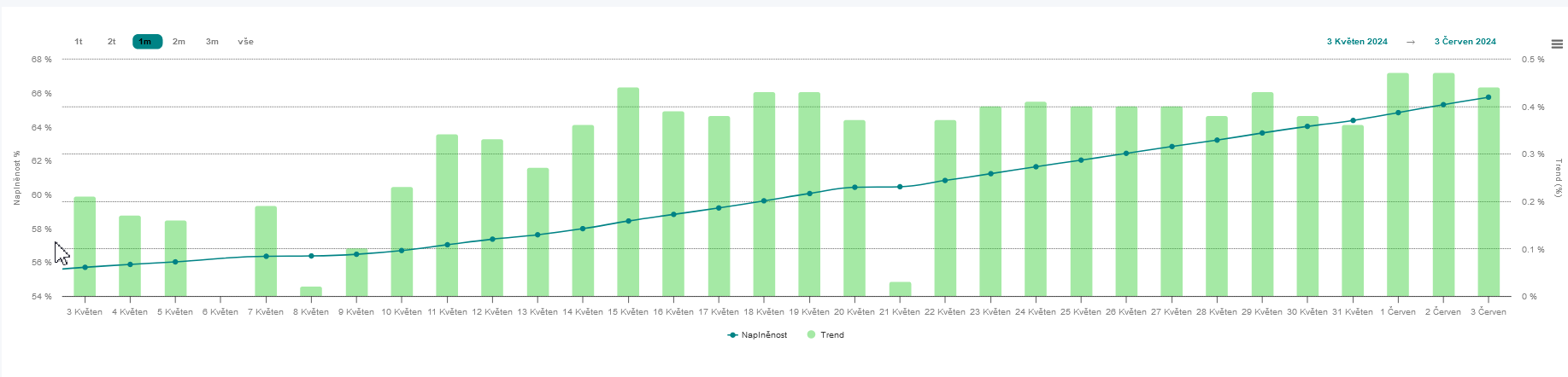 Zásoby plynu v Česku k 3.6. dosáhly 65,73% naplněnosti zásobníků. Z porovnání dat s minulým rokem vyplývá, že letos jsou zásoby zhruba o 5 procentních bodů nižší než ve stejném období loňského roku, kdy dne 3.6. 2023 byly naplněny z 70,38 %.