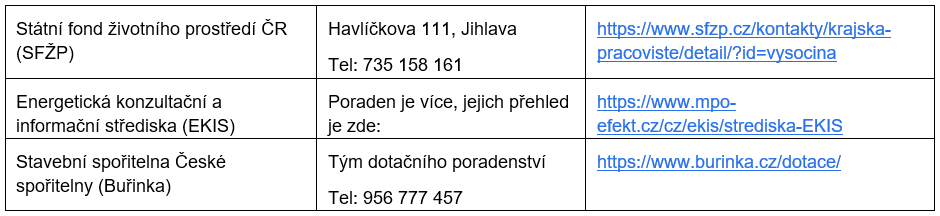 Bezplatné dotační poradenství poskytuje Státní fond životního prostředí ČR, EKIS (Energetická konzultační a informační střediska) a nově také stavební spořitelny.