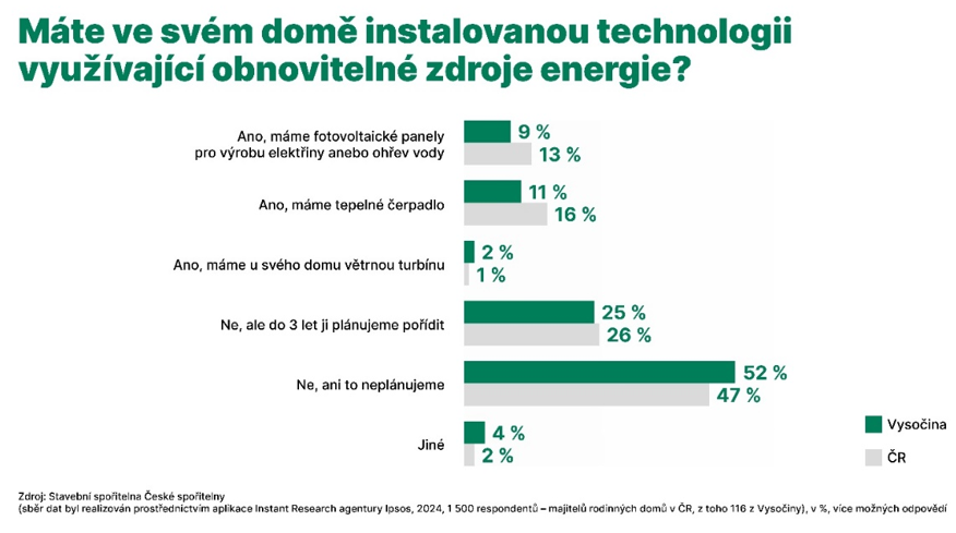 Třetina majitelů rodinných domů na Vysočině platí za energie a vytápění přes 60 000 korun ročně. Pro srovnání, v Pardubickém kraji je to jen 21 % respondentů, v celorepublikovém průměru 29 %. „Pokud majitelé rodinných domů zrealizují potřebná opatření, jako např. zateplení, výměnu zdroje tepla za modernější a úspornější, je podle naší studie možné v kraji Vysočina uspořit 54 % energie potřebné na vytápění. Potenciál pro pozitivní změnu tedy vidím velký,“ říká Libor Vošický, předseda představenstva Stavební spořitelny České spořitelny.