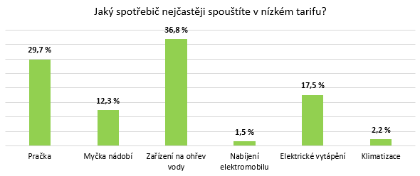 Téměř 30 % respondentů, kteří využívají nízký tarif, uvedlo, že za poslední rok na nákladech za elektřinu ušetřili mezi 1 000 – 5 000 Kč. Dalších bezmála 15 % si účty za elektřinu snížilo o 5 000 – 10 000 Kč.Nejčastěji Češi v nízkém tarifu spouští zařízení na ohřev vody, pračku a elektrické vytápění