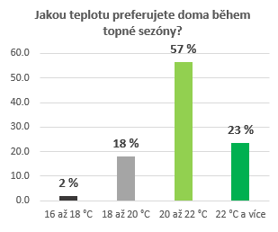 Více než pětina Čechů preferuje v domácnostech teplotu 22 °C a více. Téměř 37 % českých domácností však kvůli aktuální situaci na trhu s energiemi muselo teplotu ve svých domácnostech snížit. Více než 40 % respondentů teplotu snížilo o 2 až 3 stupně. Celkem 18 % Čechů rovněž plánuje investovat do úspornějšího zdroje vytápění. Odborníci se shodují, že zdravá teplota v domácnosti by se přes den měla pohybovat mezi 18 a 24 °C.