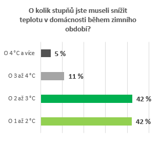 Více než třetina Čechů musela kvůli aktuální situaci na trhu s energiemi snížit preferovanou teplotu ve své domácnosti. Přes 50 % z nich snížilo teplotu v domácnosti minimálně o 2 stupně. Více než desetina respondentů dokonce o 3 až 4 °C. Téměř pětina Čechů pak kvůli aktuální situaci na trhu s energiemi plánuje investovat do úspornějšího zdroje vytápění.
