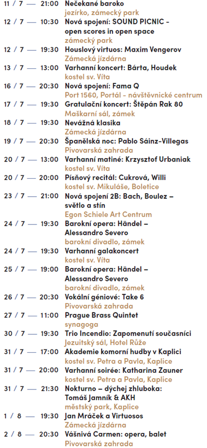 Festivalový svátek klasiky se odehraje na 15 různých místech jižních Čech, z toho v Portálu – návštěvnickém centru Portu 1560, kostele sv. Petra a Pavla a městském parku v Kaplici vůbec poprvé.