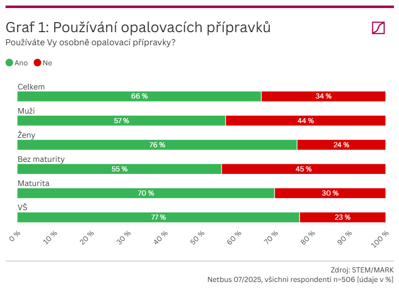 „Rozdíl mezi demografickými skupinami v používání kosmetiky s SPF je zejména o vnímání důležitosti ochrany pokožky před slunečním zářením a uvědomění si rizik spojených s nadměrným sluněním. Navíc ženy jsou zvyklé více pečovat o svou pleť, nejen s ohledem na své zdraví, ale i vzhled,“ dodává Jitka Haiderová z agentury STEM/MARK.