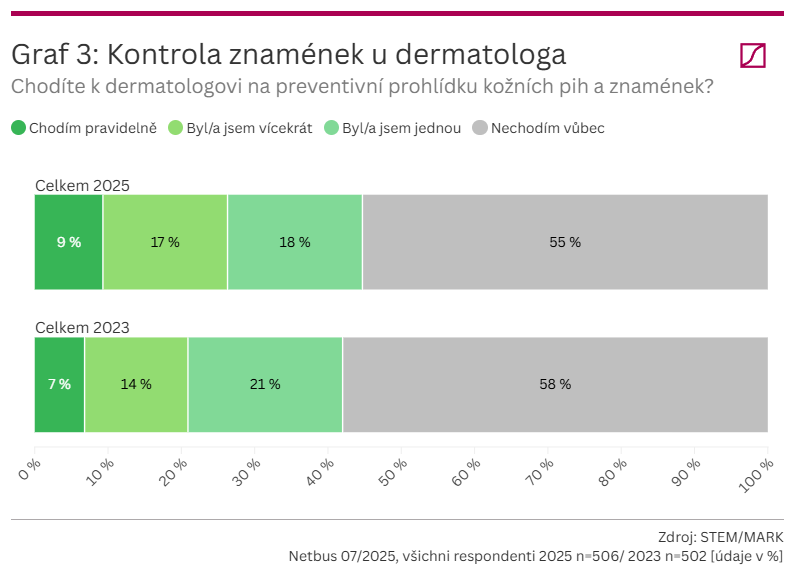„Přesto, že množství lidí podceňujících prevenci může být alarmující, tak dobrou zprávou je, že ve srovnání s rokem 2023 mírně vzrostl podíl lidí, kteří dermatologa navštěvují pravidelně a opakovaně,“ dodává Jitka Haiderová z agentury STEM/MARK.