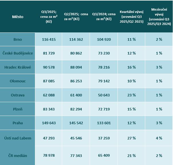 V Praze šlo v měsících třetího čtvrtletí letošního roku koupit starší byt v dobrém stavu v průměru za 149 643 korun za metr čtvereční. Při koupi bytu o rozloze 80 metrů čtverečních si tak lidé museli připlatit zhruba 1,3 milionu korun oproti stejnému období loňského roku a za takový byt zaplatili v průměru téměř 12 milionů korun. V Brně se cena staršího bytu obdobné rozlohy pohybovala podle posledních dat v průměru kolem 9,3 milionu korun, což odpovídalo 116 400 korunám za metr čtvereční a ceně o 920 tisíc korun vyšší, než byla ve třetím kvartálu roku 2024. V Ostravě se cena dostala na 62 tisíc korun za metr čtvereční a v Ústí nad Labem cena za metr čtvereční u starších bytů přesáhla hodnotu 47 tisíc korun.