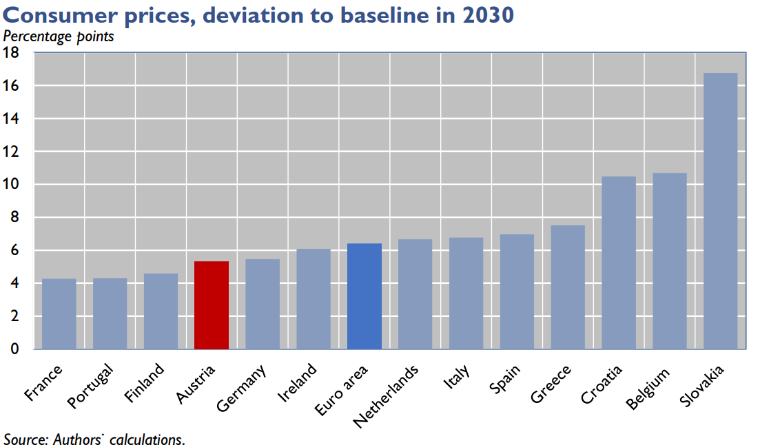 Protože je Slovensko méně ekonomicky rozvinutou ekonomikou než Německo, byly by v rámci eurozóny zvláště tam makroekonomické důsledky tíživé, plyne dále ze studie rakouské centrální banky. A to i když, samozřejmě, bude pro celou eurozónu, resp. celou EU platit jedna cena emisí, resp. emisní povolenky. Která má být roku 2030 modelově oněch 668 eur, nikoli 750.