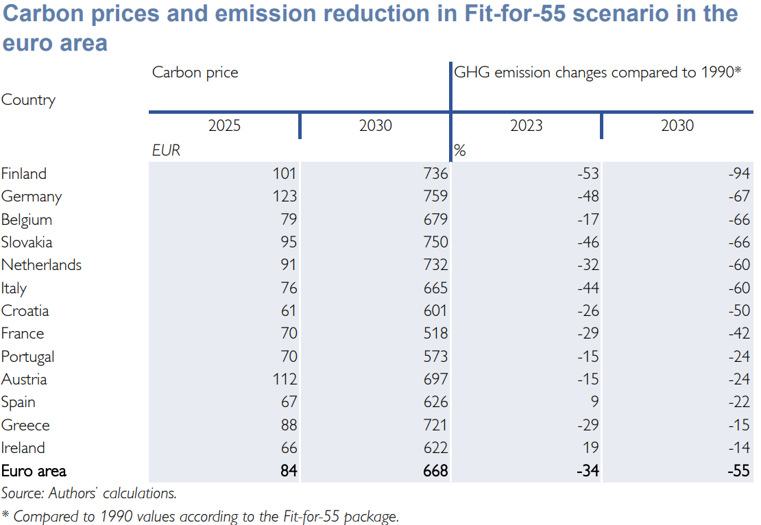 Autoři se zaměřují pouze na země eurozóny, ale za celou EU nutně platí velmi podobná cifra, protože ekonomika eurozóny letos představuje zhruba 84 procent ekonomiky EU. I mezi zeměmi eurozóny však panují značné modelové rozdíly. Například na Slovensku by měla dle uvedené studie cena emisí vyjít roku 2030 na 750 eur za vypuštěnou tunu oxidu uhličitého nebo ekvivalentu, a v Německu dokonce na 759 eur (viz tabulka níže), pokud by ceny emisí, resp. povolenky měly kompletně zajišťovat redukci emisí v eurozóně tak, aby byl splněn program Fit for 55, tedy aby emise skleníkových plynů klesly do roku 2030 o 55 procent v porovnání s rokem 1990.