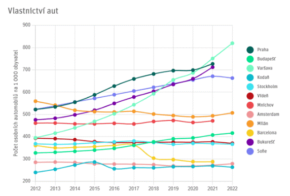 Graf níže z dílny IPR Praha (viz https://app.iprpraha.cz/apl/app/praha-v-evropskem-kontextu/dojizdeniníže) zachycuje trend uplynulých let, kdy v městech zemí střední a východní Evropy – tedy v zemích bývalého východního bloku – přibývá aut v přepočtu na obyvatele tak výrazně, že už zřetelně předčí západní města, která druhdy dominovala.