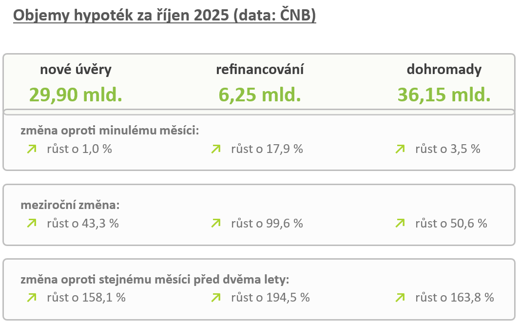V měsíci říjnu to podle údajů České národní banky bylo přes 36 mld. Kč. Z toho zhruba 30 mld. Kč tvořily nově poskytnuté hypotéky, zbylých asi 6 mld. Kč bylo refinancování.