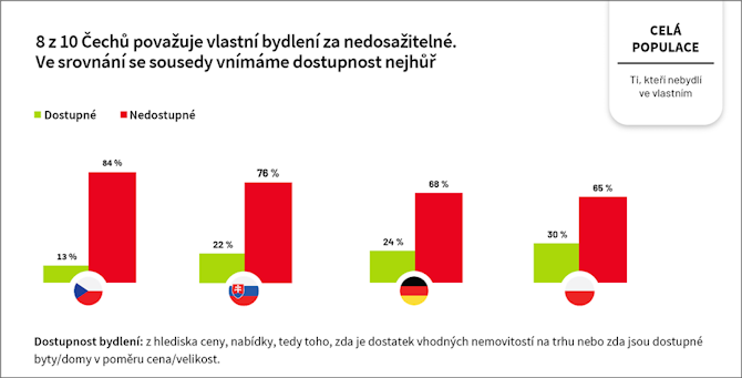 Česká republika patří k zemím s vysokým podílem vlastnického bydlení. I přes přetrvávající preferenci vlastnického bydlení se podíl obyvatel bydlících ve vlastním domě nebo bytě snižuje přibližně o 1 % ročně. Osm z deseti Čechů, kteří nyní nebydlí ve vlastním, označuje pořízení nemovitosti za nedostupné. V generaci Z je tento podíl ještě vyšší (devět z deseti). Ve srovnání s Němci, Poláky i Slováky hodnotí Češi dostupnost vlastního bydlení nejkritičtěji. Vyplývá to z mezinárodního průzkumu Modré pyramidy stavební spořitelny realizovaného v Česku, na Slovensku, v Německu a Polsku. Ten zároveň ukázal, že jednotlivé země se výrazně liší i v přístupu k samotnému bydlení: zatímco Češi investují spíše do pohodlí domácnosti, Němci se více zaměřují na úspory energií a Slováci déle setrvávají v rodinném zázemí.