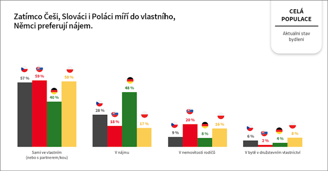 Pokud jde o náklonnost k vlastnímu bydlení, patří Češi dlouhodobě mezi rekordmany. 62 % z nás by si ideálně zvolilo vlastní rodinný dům, 26 % pak vlastní byt. Ještě jednoznačnější je situace na Slovensku, kde dává vlastnímu bydlení přednost 91 % lidí – nejvíce ze všech sledovaných zemí. Naopak Němci prahnou více než čtyřikrát častěji po nájemním bytě. Za ideální ho považuje dokonce 26 % Němců oproti průměrným 6 % respondentů z ostatních zemí.