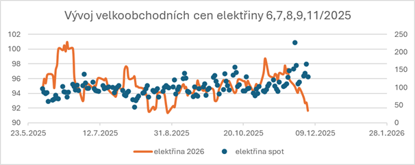 Na spotovém trhu s elektřinou pozorujeme růst cen zejména proto, že s přicházející zimou roste a výroba z obnovitelných zdrojů – především fotovoltaiky – už není tak vysoká jako v létě. U spotu proto hraje menší roli vývoj cen komodit a větší roli okamžitý poměr nabídky a poptávky.