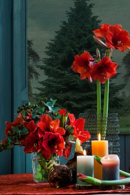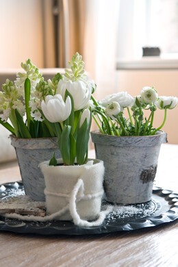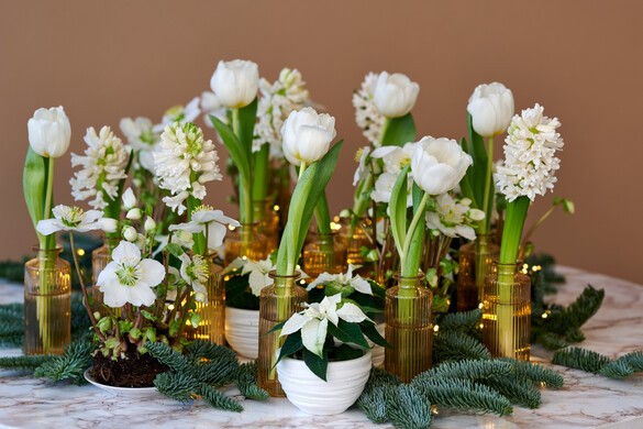 Bílé tulipány (Tulipa) jsou symbolem světla a nového života a jsou skutečnou vánoční klasikou. Vánoční stůl by bez nich nebyl úplný. Vázu s tulipány můžete kombinovat s kvetoucími cibulovinami v květináčích a vytvořit tak slavnostní atmosféru. O Vánocích si můžete vybrat z různých květin rostoucích v květináči, jako jsou hyacinty (Hyacinthus), tulipány (Tulipa), modřence (Muscari) a hvězdníky (Hippeastrum). Hvězdník upoutá pozornost především velikostí svých květů. Dáváte přednost něčemu decentnějšímu? Krásným symbolem nového života je také hvězdník rostoucí v květináči s čerstvě vyrašenými zelenými listy.Tip: Vytvořte si pohádkovou vánoční atmosféru pomocí bílých nebo pastelově zbarvených květin. Vyberte si odstíny červené nebo fialové, které dodají vašemu vánočnímu stolu hřejivý a stylový vzhled.