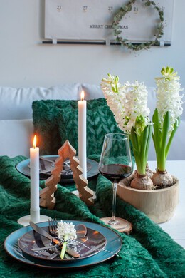 Snadným způsobem, jak vytvořit slavnostní atmosféru, je také vystavení kvetoucích cibulovin v kolekci skleněných váz. Podobně můžete sestavit kolekci různých květin v květináčích. Použijte různé výšky a odrůdy, čímž získáte luxusní vzhled. Dáváte přednost pouze jednomu květinovému prvku na stole? Pak si vyberte nádhernou kytici tulipánů nebo krásnou mísu s různými květinami v květináčích. Vánoční atmosféru dotvoříte šňůrou pohádkových světýlek nebo girlandou zlatých hvězd.Tip: Ujistěte se, že vaše květinová výzdoba není příliš vysoká. Během štědrovečerní večeře chcete vidět hosty na druhé straně stolu.