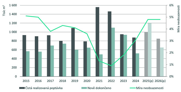 Třetí čtvrtletí 2025 bylo z hlediska poptávky druhé nejsilnější za posledních dvacet let. Táhlo jej šest velkých transakcí, převážně v Praze a jejím okolí. Za celý rok 2025 by se mělo znovu dosáhnout cca 1 mil. m² nově pronajatých průmyslových a logistických ploch. Na trhu je patrný obnovený zájem e‑commerce, který zvyšuje poptávku po kvalitních logistických a distribučních prostorech. Rok 2025 přinesl významné transakce v distribučním i retailovém segmentu, což potvrzuje oživení e‑commerce; navíc podobný vývoj se očekává i v příštím roce. Podle CBRE by se trh v roce 2026 mohl stabilizovat na úrovni kolem 850 tis. m² nově pronajatých ploch.