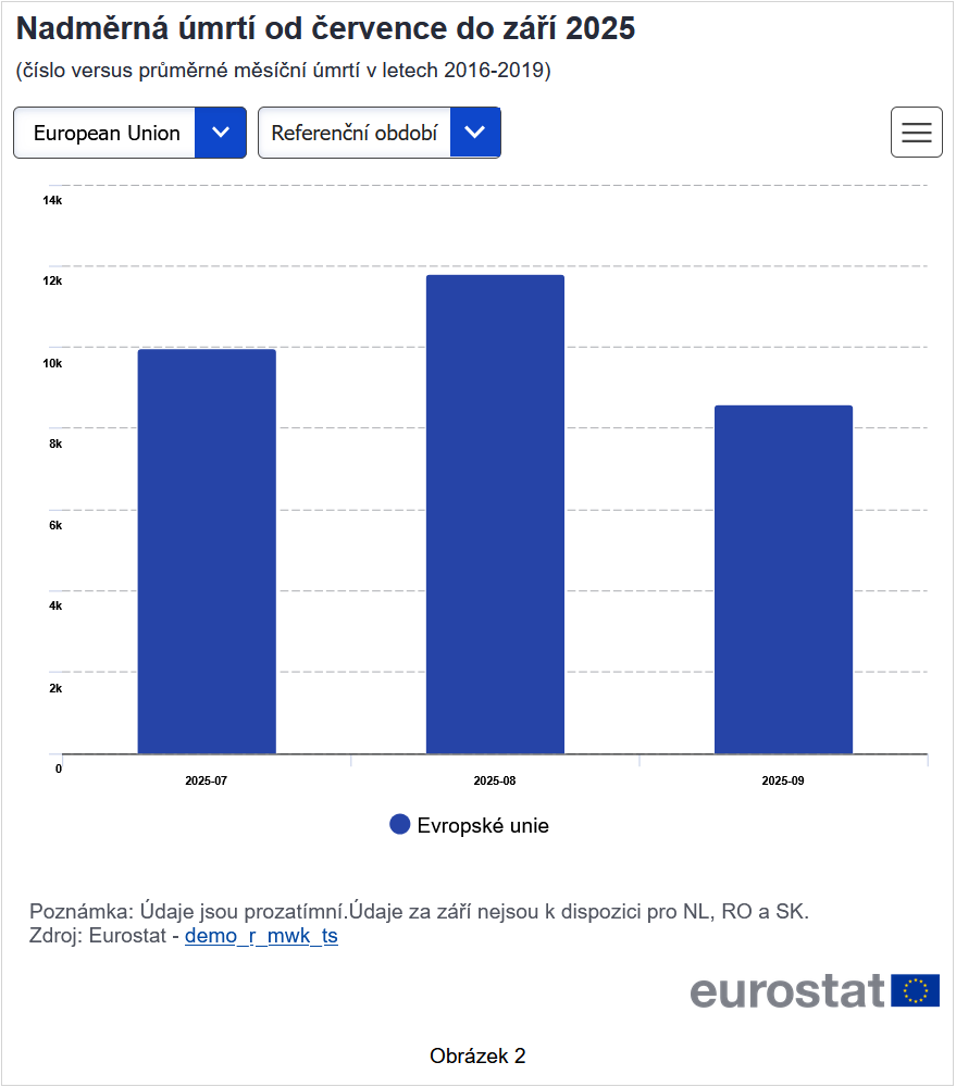 Měsíční ukazatel nadměrné úmrtnosti přebírá počet úmrtí z jakékoli příčiny v každém období a porovnává jej s historickým výchozím stavem oproti předchozím letům v období, které nebylo ovlivněno pandemií COVID-19. V tomto případě se základní linie skládá z průměrného počtu úmrtí, ke kterým došlo každý měsíc v období 2016–2019. Průměrná výchozí hodnota Evropské unie (EU) pro období 2016–2019 nebyla upravena o věkově specifickou úmrtnost ani o zvýšení průměrné délky života. Ukazatel je vyjádřen jako procento dodatečných úmrtí ve srovnání s výchozím obdobím (2016–2019). Záporné procento naznačuje, že v určitém měsíci bylo méně úmrtí, než by se dalo očekávat ve srovnání se základním obdobím. Ukazatel nadměrné úmrtnosti, který se týká zemí EU a ESVO, vychází z týdenních údajů o úmrtích, které Eurostatu předávají země EU na dobrovolném základě od dubna 2020. Údaje jsou klasifikovány podle pohlaví, věkových skupin 5 let a regionů NUTS a jsou průběžně aktualizovány s novějšími týdny statistik úmrtnosti. Tyto týdenní údaje jsou pak připisovány poměrné měsíce, aby se vypočítal indikátor nadměrné úmrtnosti. Pokud jde o ukazatel nadměrné úmrtnosti, údaje o úmrtích za poslední týdny, které jsou v členském státě k dispozici, jsou korigovány pro neúplnost. Údaje zůstávají prozatímní a s dalšími vydáními jsou předmětem revize. Všech 27 zemí EU poskytlo údaje o měsíční úmrtnosti. Údaje získané ze zemí ESVO a sousedních zemí nejsou v tomto článku uvedeny. Souhrn EU za třetí čtvrtletí 2025 byl odhadován na základě nejnovějších dostupných údajů. Zářijové údaje na úrovni země pro Nizozemsko, Rumunsko a Slovensko nebyly k dispozici; odhadované hodnoty však byly použity pro agregáty na úrovni EU a nadbytečná úmrtí. Údaje pro několik zemí byly od roku 2024 přepočítány aplikací nových koeficientů úplnosti dat přenášených Národními statistickými instituty v květnu 2025 Další informace o metodice naleznete v nadměrných úmrtnostních metadatech.