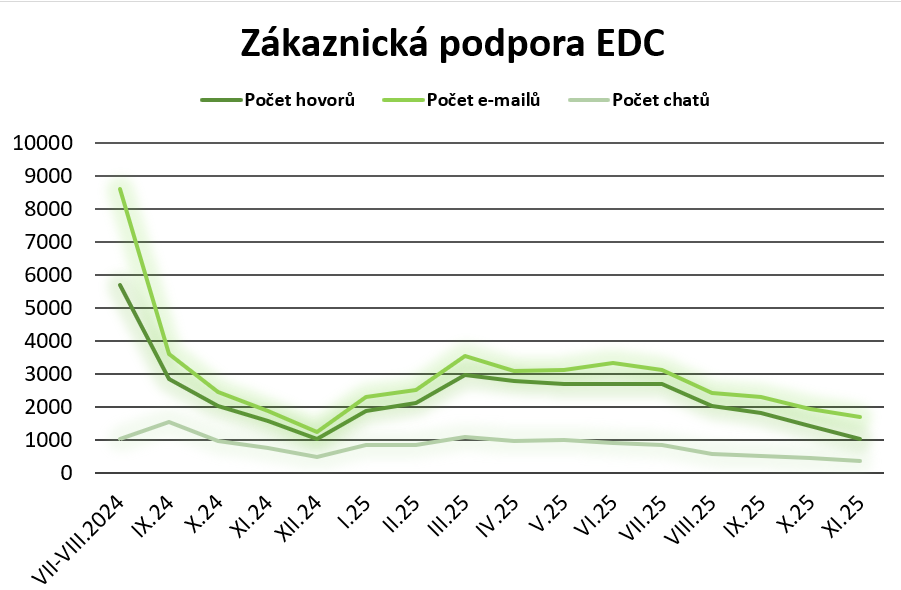 Elektroenergetické datové centrum spustilo registrace ke sdílení elektřiny v srpnu 2024 a zákaznickou linku již o měsíc dříve. Od té doby zaznamenalo formou e-mailů, telefonátů nebo zpráv na chatu téměř sto tisíc dotazů. „Z pohledu komunikace s uživateli a zájemci o sdílení můžeme vyhodnotit celý cyklus dvanácti měsíců napříč ročními obdobími. Z něj je patrné, že počáteční otazníky spojené se startem EDC a s novou službou zmizely, a i s přibývajícím množstvím uživatelů počet dotazů v posledních měsících klesá. Vnímám to tak, že se nám sdílení elektřiny podařilo v České republice etablovat jako spolehlivou a srozumitelnou službu v energetice,“ uzavřel P. Kusý.
