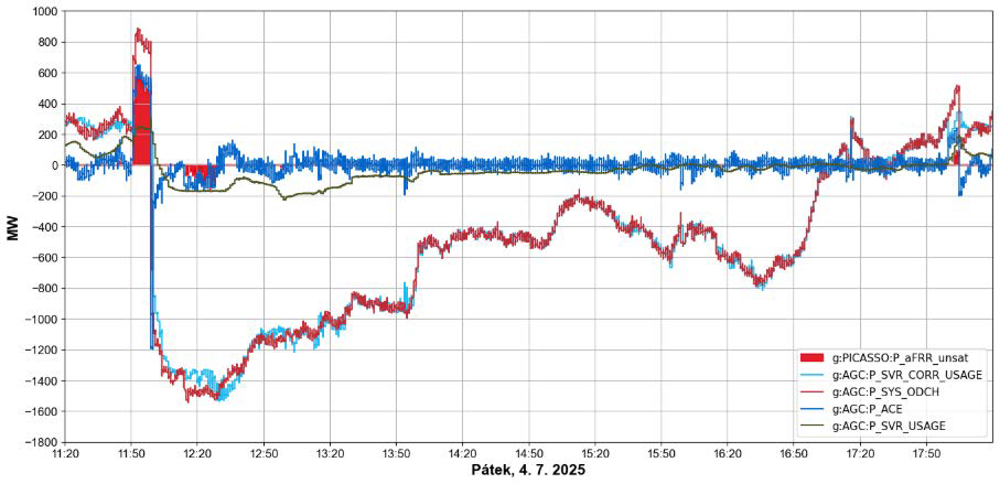 V důsledku výpadku výroby byla soustava až do vzniku ostrova a jeho kolapsu deficitní s nepokrytou odchylkou až cca 600 MW. Po kolapsu ostrova se situace obrací a soustava je významně přebytková (až 1500 MW). Celý průběh aktuální odchylky je zobrazen na grafu níže.