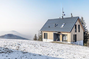 Díky velkoformátovým oknům získali členové horské služby nejen dobrý přehled o situaci na Javorovém vrchu, nýbrž i dostatek světla v interiéru. „U otvorových výplní jsme museli počítat s vysokým namáháním klimatickými vlivy. Požadavkem také bylo, aby vydržely minimálně dalších padesát let provozu v horském prostředí. Zvolili jsme proto provedení z dřevohliníku. Ten kombinuje dřevěné rámy, které výborně izolují teplo, a vnější hliníkové opláštění, které je velmi odolné a bezúdržbové,“ říká jednatel realizační firmy a vyjadřuje se i k výběru a zpracování střechy: „S ohledem na okolní krajinu byla pro budovu vybrána hliníková střešní krytina SATJAM Rapid DeLuxe v barvě antracit, čímž zároveň ladí i s okny.“