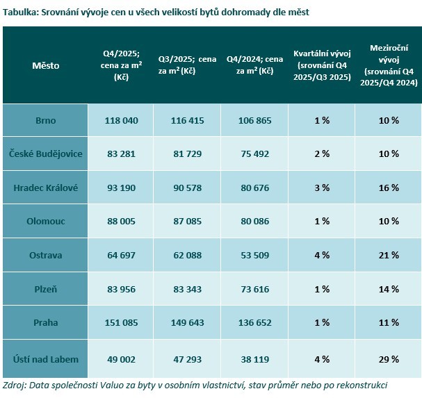 Ceny starších bytů v České republice v závěru roku 2025 dále rostly, a to jak v meziročním, tak v kvartálním srovnání. Ve zkoumaných 8 městech byty meziročně zdražily od 10 procent v případě Brna či Olomouce do 29 procent v Ústí nad Labem. V Praze pak starší byty zdražily o 11 procent. Mezi čtvrtletími se ceny zvedaly v jednotkách procent. Vyplývá to z analýzy společnosti FérMakléři.cz na základě dat společnosti Valuo. Trh tak potvrzuje pokračující růstový trend napříč regiony.