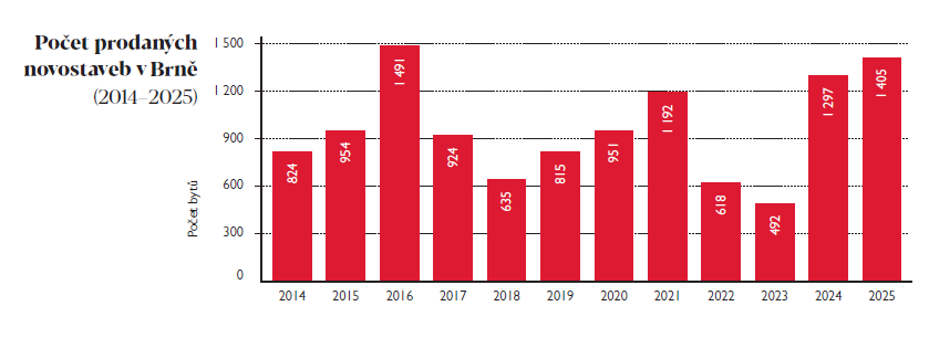 Brno – Rok 2025 se zařadil mezi nejúspěšnější v historii brněnského realitního trhu. Podle dat společnosti Trikaya, která trh dlouhodobě sleduje, se v průběhu roku v moravské metropoli prodalo 1 405 nových bytů, což představuje nejvyšší roční objem prodejů za posledních téměř deset let. Zároveň výrazně vzrostly ceny – průměrná nabídková cena novostaveb ve čtvrtém čtvrtletí překročila hranici 145 tisíc korun za metr čtvereční, což představuje meziroční nárůst o 11 procent.