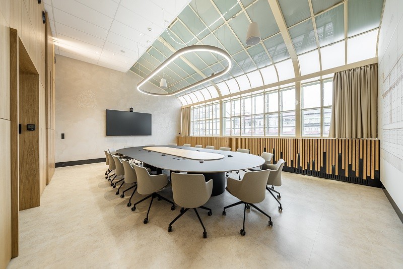 Novou zasedací místnost navrhlo studio JKH Architects s cílem vytvořit reprezentativní a funkční prostředí pro jednání až osmnácti osob. Dominantou prostoru je oválný stůl, kolem něhož bylo potřeba zvolit sezení splňující vysoké nároky na ergonomii, komfort i dlouhodobou odolnost.