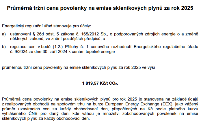 Průměrná cena povolenky na emise skleníkových plynů pro rok 2025 je stanovena na základě údajů z realizovaných obchodů na spotovém trhu na burze European Energy Exchange (EEX), jako vážený průměr uzavíracích cen za každý obchodovací den, přepočtených na Kč podle platného kurzu vyhlášeného ČNB pro daný den, kde váhou je množství zobchodovaných povolenek na emise skleníkových plynů za každý obchodovací den.