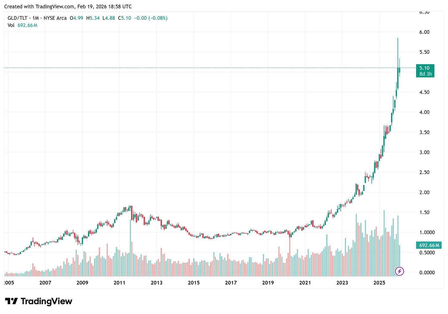 Tian Yang staví zlato do rámce „nominálních“ vs. „reálných“ nároků: když jsou deficity a dluh k HDP vysoké, klesá atraktivita čistě nominálních vládních závazků a roste preference reálných aktiv. Jako jednoduchý (a investory snadno uchopitelný) proxy zmiňuje poměr typu GLD vs. TLT – tedy reálná aktiva vs. dlouhý státní dluhopis.