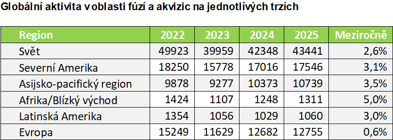 Evropské trhy se daly rozdělit do dvou skupin. Největší evropské trhy dosáhly vrcholu své aktivity v roce 2024, následně se v roce 2025 vrátily na svou dlouhodobou úroveň. Jmenovitě šlo o čtveřici Francie (-3,4 procenta), UK (-8,7 procenta), Španělska (-21 procent) a Švédska (-25,8 procenta), které společně tvoří celých 50 procent aktivity na evropském M&A trhu. Zbylé země Evropské unie zaznamenaly mírný stabilní růst s výjimkou Itálie (+64,2 procenta), která v roce 2025 vynahradila zadrženou aktivitu z minulých let. Celkově se evropský trh fúzí a akvizic zbavil nahromaděných vnitřních nerovnováh a nyní se nachází v ideální pozici pro stabilní růst v následujících letech.