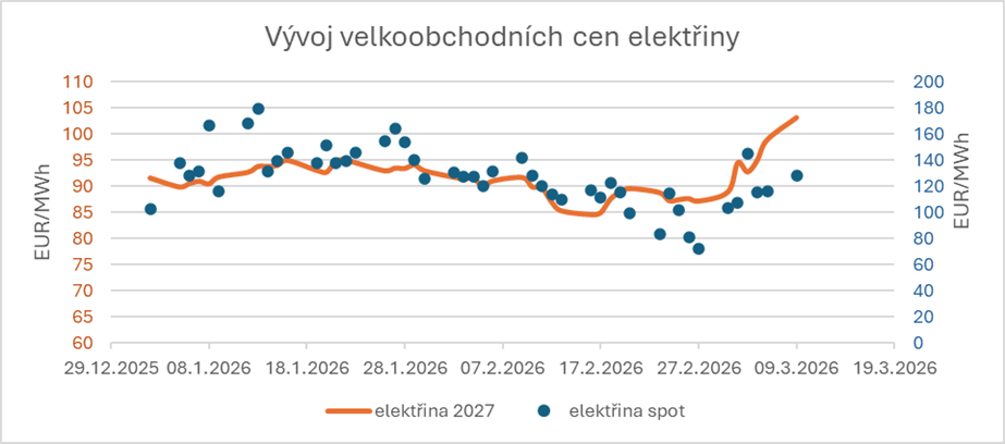 Velkoobchodní ceny elektřiny a plynu byly od začátku roku do začátku března ovlivňovány zejména nestandardně chladným počasím. Teploty v lednu a únoru snížily stavy zásobníků s plynem a ceny tak mírně vzrostly. Následné teplé počasí nervozitu opět o něco snížilo a ceny na energetických trzích poklesly.