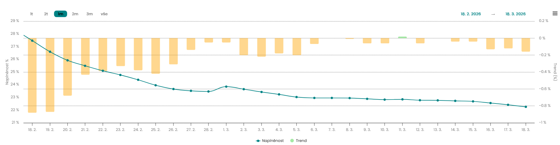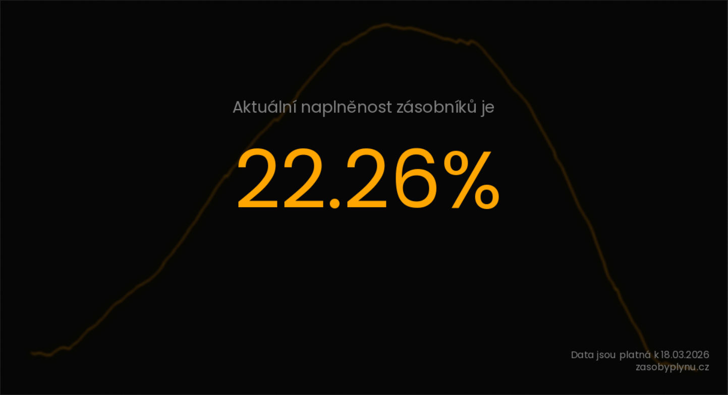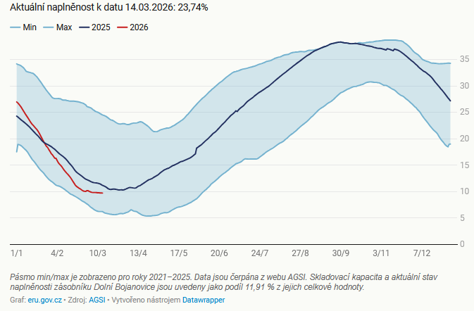 Zásobníky byly k 18.3. naplněny z 22,26 %, resp. činí 8927,2 GWh plynu. Ze statistiky týkající se zásob plynu určených pro spotřebu v Česku vyplývá, že při průměrné roční spotřebě by současné zásoby vydržely na 35 dnů.