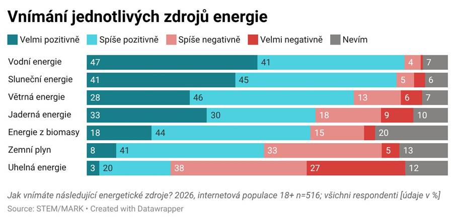 Vodní energie (88 % pozitivních hodnocení) a sluneční energie (86 %) jsou Čechy přijímány nejlépe ze všech energetických zdrojů. Větrná energie se umístila na třetím místě s 75 % pozitivní odezvou. Nejhorší hodnocení má uhelná energie s 23 % pozitivním hodnocením.