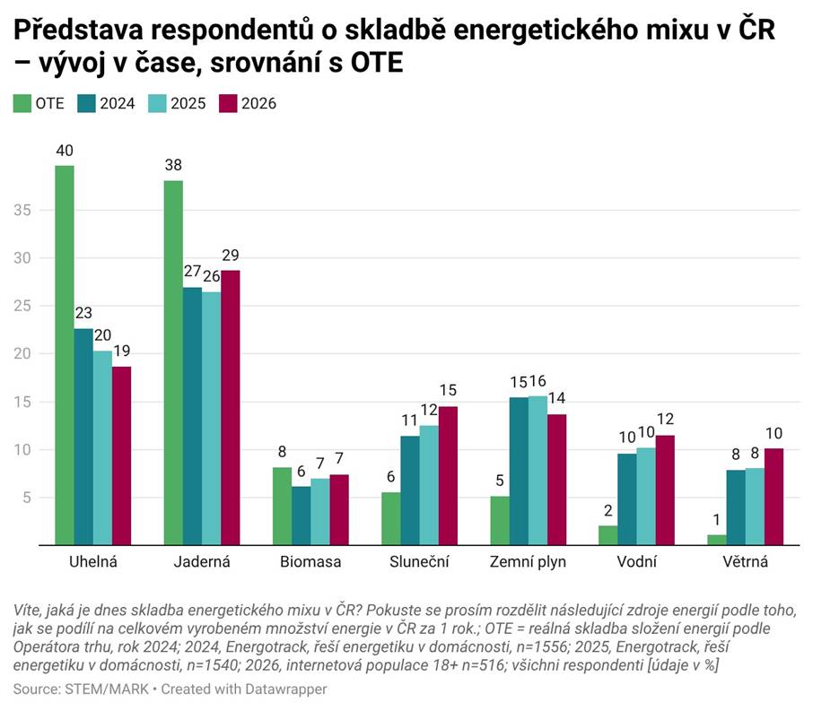 STEM/MARK sleduje opakovaně v rámci studie Energotrack . Ta obecně ukazuje, že Češi (ve věku 25-69 let, v domácnosti rozhodují o otázkách energií) obnovitelné zdroje vnímají pozitivně, nemají představu o jejich reálném podílu na výrobě energie v ČR, kde značně nadhodnocují OZE a zemní plyn na úkor uhlí a jádra. To potvrzuje i aktuální březnový výzkum v rámci internetové populace v ČR.