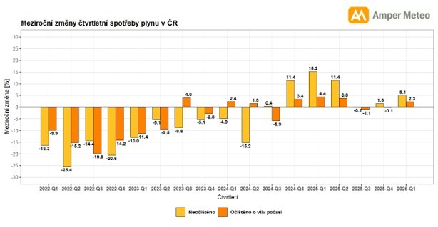 Spotřeba plynu v 1. čtvrtletí meziročně vzrostla o 5,1 %, významnou roli v tom však sehrálo počasí. Po jeho zohlednění by růst činil jen 2,3 %. Nejvýraznější nárůst byl zaznamenán v lednu, a to o 18,8 %, respektive o 5 % po očištění o vliv počasí. V únoru a březnu naopak spotřeba meziročně klesla. Po přepočtu na stejné počasí by únor vykázal mírný růst, zatímco březen by představoval mírný pokles. „Oproti období před energetickou krizí (2017-2021) spotřebováváme nadále méně plynu, i když tentokrát pokles nebyl tak výrazný jako v minulých kvartálech. Reálný pokles byl jen okolo 10 %, kdy ještě před dvěma roky to bylo více než 17 %. Ochota šetřit plynem v Q1/2026 byla tedy menší, což se pravděpodobně vzhledem ke geopolitické situaci v dalších kvartálech opět změní. Očekáváme, že současná vyšší cenová hladina plynu se udrží déle než v řádu týdnů. Mezi mezinárodními analytiky převažuje shoda, že i při kupříkladu přijetí příměří v íránském konfliktu na trhu zůstane nejistota průjezdnosti Hormuzského průlivu, která se projevuje primárně vyššími cenami pojištění tankerů a pojišťovny zůstanou patrně opatrnější po delší dobu,“ odhaduje Jan Palaščák, zakladatel skupiny Amper.