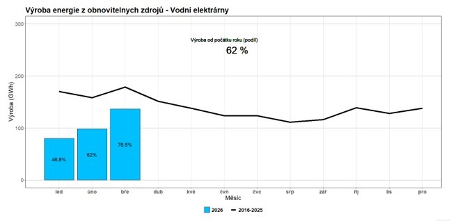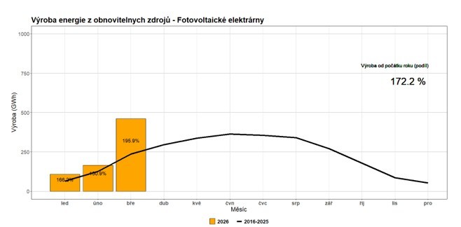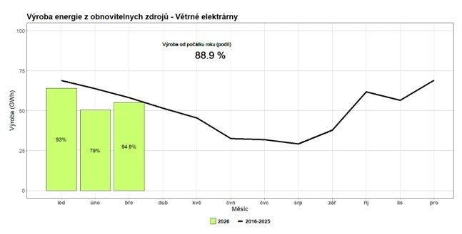 V uplynulém kvartálu se vyrobilo 1217 GWh elektrické energie z fotovoltaických, větrných a vodních elektráren. To je meziročně o 11 % méně a oproti průměru 2016-2025 je to jen mírný nárůst o 8 %. Na výrobě z OZE se z 60,3 % podílely fotovoltaické elektrárny, z 25,8 % vodní elektrárny a z 13,9 % větrné. Tyto tři zdroje by dokázaly pokrýt spotřebu elektřiny v České republice z 6,3 %. Tento negativní výsledek je způsoben hlavně velmi slabou výrobou z vodních zdrojů, která byla zapříčiněna podprůměrným množstvím sněhové pokrývky i srážek.