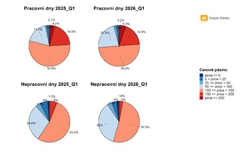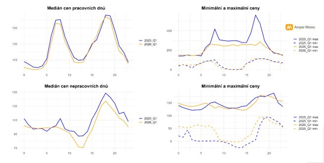Cena elektřiny meziročně nebyla během pracovního týdne zásadně rozdílná. Větší rozdíly zaznamenáváme o víkendech, kdy letos byly ceny o něco nižší. Celkově byl medián spotové ceny elektřiny 113 EUR/MWh, což bylo o 6 % méně než v uplynulém roce (Q1/2025). Letos nedocházelo k tak výrazným cenovým skokům nahoru. Zatímco v loňském prvním čtvrtletí dosáhla maximální cena 563 EUR/MWh, letos to bylo pouze 286 EUR/MWh.