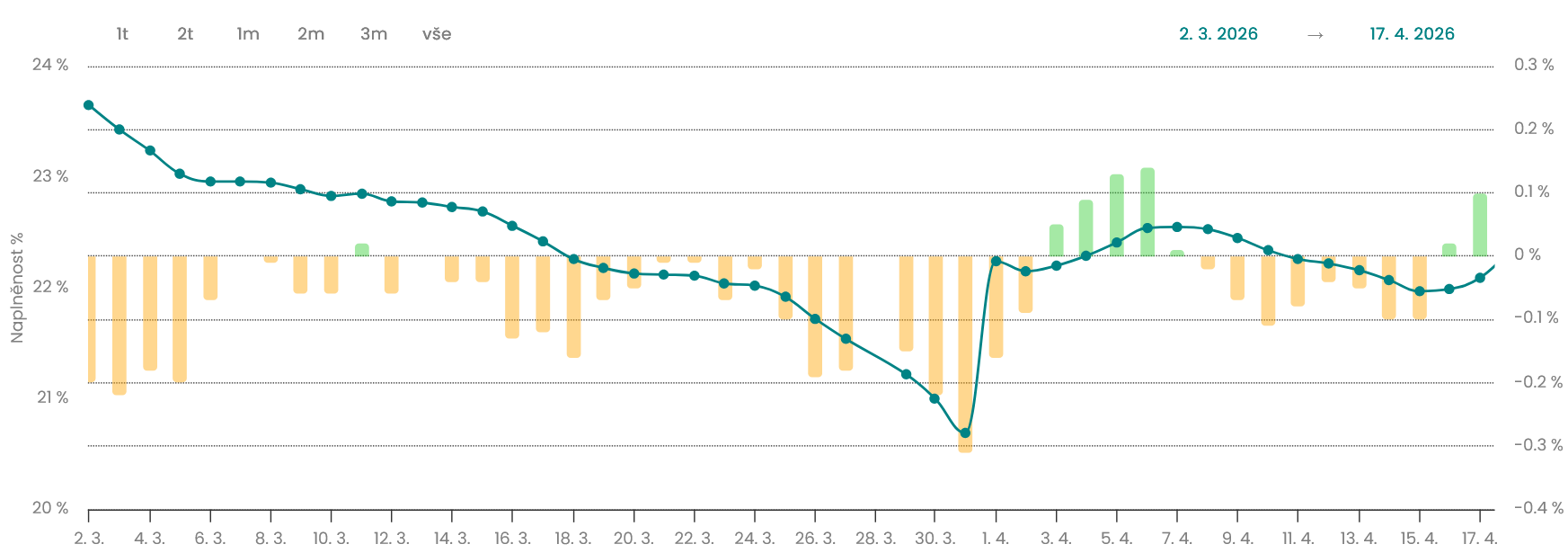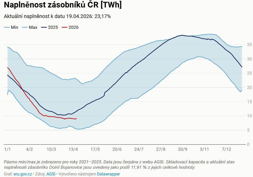 Zásobníky byly ke 17.4. naplněny z 22,09 %, resp. činí 8703,5 GWh plynu. Ze statistiky týkající se zásob plynu určených pro spotřebu v Česku vyplývá, že při průměrné roční spotřebě by současné zásoby vydržely na 35 dnů. Při zohlednění zimní spotřeby pak na 20 dnů. Pokud by se zásoby měly využít v zimním období pouze pro domácnosti vystačily by na 76 dnů. Plnění zásobníků se poslední dny pohybuje na úrovni 66,43 GWh. Odběr plynu ze zásobníků je dle posledních dat 27 GWh/den.