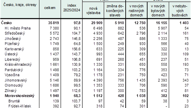 Podle předběžných výsledků bylo v Moravskoslezském kraji v průběhu roku 2025 dokončeno 2 599 bytů, což bylo o 619 bytů více než v roce předešlém. Ve sledovaném roce stavbaři zahájili výstavbu 1 940 bytů, z toho více než polovinu (53
