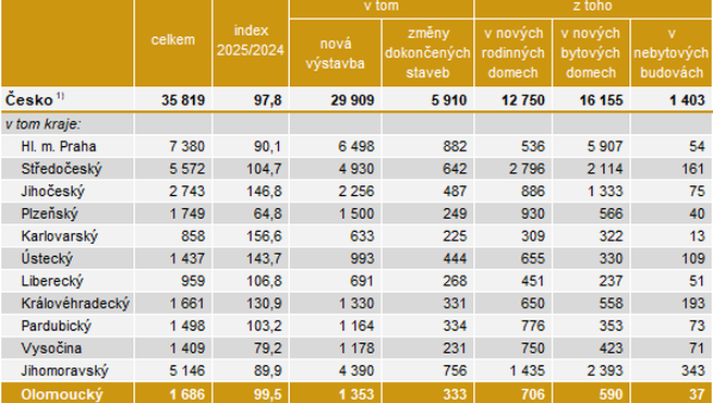 Podle předběžných výsledků bylo v Moravskoslezském kraji v průběhu roku 2025 dokončeno 2 599 bytů, což bylo o 619 bytů více než v roce předešlém. Ve sledovaném roce stavbaři zahájili výstavbu 1 940 bytů, z toho více než polovinu (53