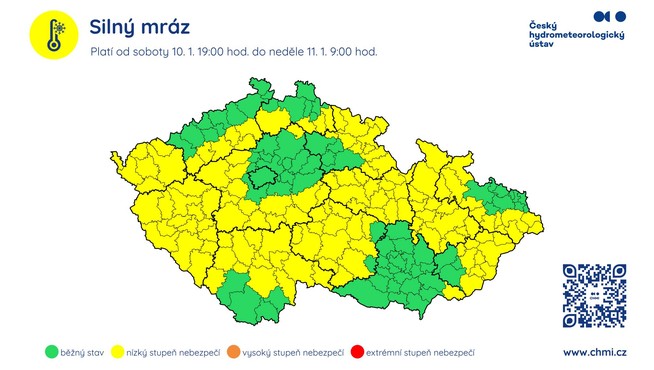 Mráz pod -12 °C - v přílivu studeného vzduchu od severu budou noční a ranní teploty v nedělí 11. 1. klesat místy pod -12 °C, na celém území s výjimkou jihu Moravy pak v noci na pondělí (12. 1.) a v pondělí ráno