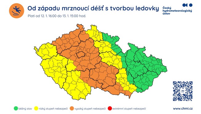Hrozby zimního počasí - silný mráz, sněhové jazyky, mrznoucí déšť s tvorbou ledovky. Hrozí nebezpečí úrazů při chůzi, problémy v dopravě a zvýšená nehodovost. Může docházet i k výpadkům v dodávce elektřiny