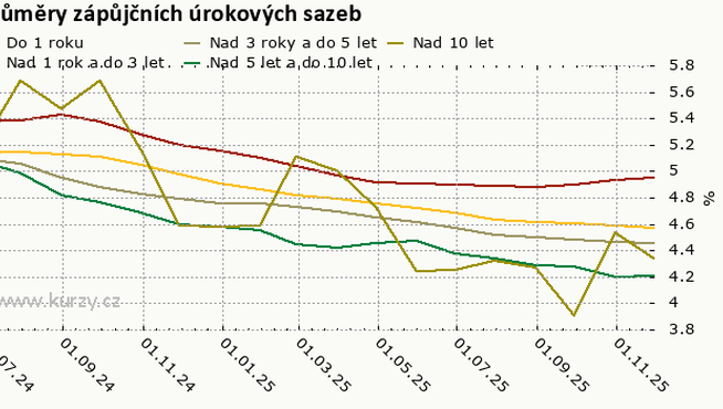 bb Název ukazatele - Údaje k 30.11.2025 Hodnota Předchozí Změna Před rokem Změna Fixace úrokové sazby do 1 roku 4.95 4.94 0.30 % 5.20 -4.82 % Fixace úrokové sazby nad 1 rok do 3 let 4.57 4.59 -0.45 % 4.98 -8.