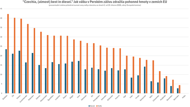 Česku opět málem náleží jeden primát v rámci zemí EU. Motorová nafta totiž v ČR zdražila v reakci na válku v Íránu vůbec v druhém nejvýraznějším procentuálním rozsahu ze všech zemí EU, a to v přepočtu do eur o 40,2 procenta, plyne z dnešních nových...