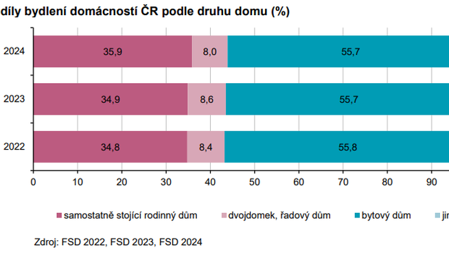 V letech 2022 až 2024 bylo v ČR téměř 4,6 milionu hospodařících domácností. V těchto domácnostech žilo zhruba 10,5 milionu osob, průměrná velikost domácnosti ve sledovaných letech byla 2,3 osoby.