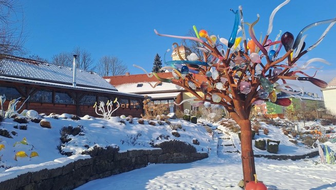 Ne každá zahrada je krásně rozkvetlá i v zimě. Ta skleněná skláře Jiřího Pačinka ano. Říká se jí křišťálová a nachází se v zahradě firmy Pačinek Glass v Kunraticích u Cvikova na Českolipsku na severu Čech