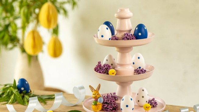 Malovaná vajíčka, čerstvě upečený mazanec, sladkosti pro koledníky: aby na svátečním stole vše krásně vyniklo, vytvořte si praktický etažér. Ten poslouží nejen k servírování velikonočních dobrot, ale také jako nepřehlédnutelná hravá dekorace.