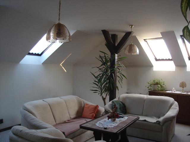 Otázka: Dobrý den,paní Markéto mám ještě jeden dotaz budeme předělávat obývací pokoj,který je 6,5mx5m podkroví a 4střešní okna.Nábytek budeme pořizovat nový pouze pár skřínek asi v černé barvě ,sedačka prozatím zůstane a je v barvě slonová kost.Na nejkratší straně rovné zdi bude pověšená nad tv stolkem plazma a sedačka proti pod střešními okny.Zatím nás nenapadlo jiné umístění vzhledem ke sloupu a šikmé dlouhé stěně.Nevím si rady s výmalbou a barvou koberce.Přikládám foto pro lepší představu.Předem děkuji za radu a přeji krásný den Jana